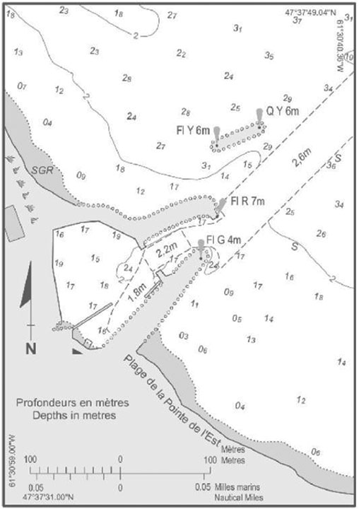 Dans le cadre du Programme des ports pour petits bateauxNote de bas de page 4 , le MPO gère les ports, dont celui de Grosse-Île, et en fait l'entretien afin de veiller à ce qu'ils soient sécuritaires et accessibles aux pêcheurs et aux autres utilisateurs. Les conditions météorologiques et états de mer variables font que l'importance de l'ensablement et l'étendue de la barre sableuse dans le chenal et à proximité de celui-ci fluctuent énormément d'une année à l'autre. Par conséquent, le MPO effectue chaque année des levés bathymétriques et des travaux de dragage à Grosse-Île. Des levés effectués pour le compte du MPO avant la saison de pêche au homard 2017 montraient que la barre sableuse s'étalait en travers du nouveau chenal et qu'elle réduisait à 1,6 mNote de bas de page 5 seulement la profondeur d'eau au point le plus élevé de la barre sableuse.