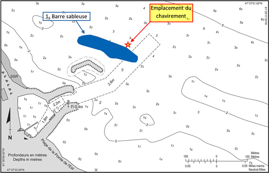 Avant l'ouverture de la saison de pêche au homard 2017, le MPO avait installé une bouée repère d'engin de pêche temporaire au sud de la barre sableuse pour indiquer ce danger. La bouée temporaire est demeurée en place pendant 1 ou 2 jours avant d'être emportée par la mer. Au moment de l'événement, cette bouée temporaire n'était plus en place pour indiquer la limite sud de la barre sableuse dangereuse.