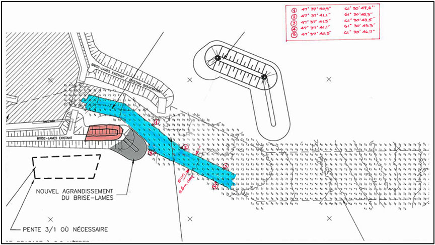 Le port de Grosse-Île sert de port d'attache à environ 45 bateaux de pêche. La navigation entre le port et la mer se fait par un chenal dragué non balisé de 50 m de large sur 415 m de long. Aucune bouée ni aide à la navigation ne balise ce chenal. En 2012, on a construit une île brise-lames (figure 3), qui a été prolongée à l'automne de 2016. Ce prolongement a nécessité, avant le début de la saison de pêche 2017, le déplacement du chenal non balisé vers le sud, parallèle à sa position d'origine (figure 4).
