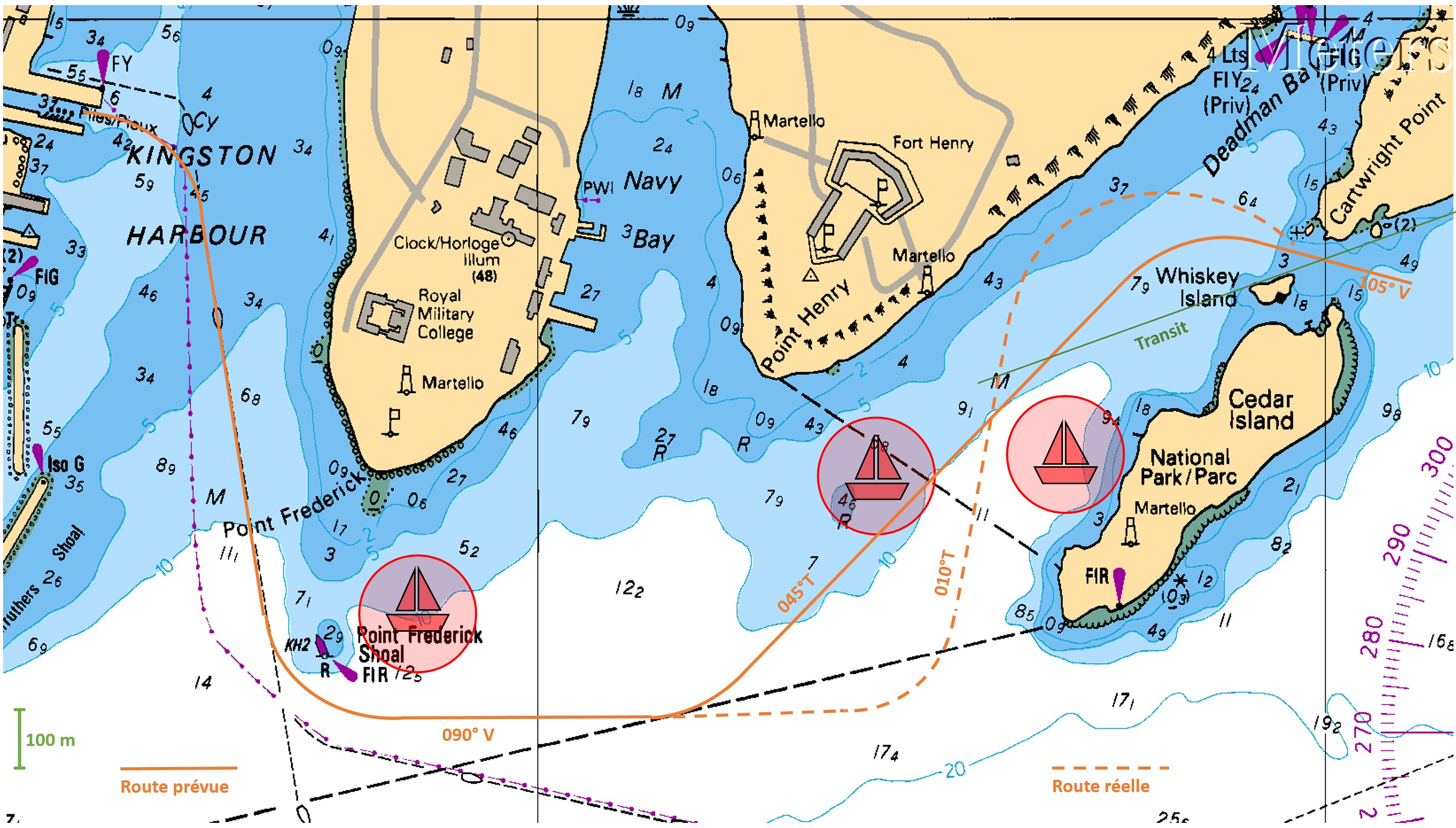 Vers 12 h 40, lorsque le navire approchait du haut-fond Point Frederick (figure 2), l’officier de pont est entré dans la timonerie. Le capitaine et lui ont tous les deux observé un groupe de dériveurs d’une école de voile (indiqués par des bateaux rouges à la figure 2) à bâbord du navire et à l’écart de la route prévue.