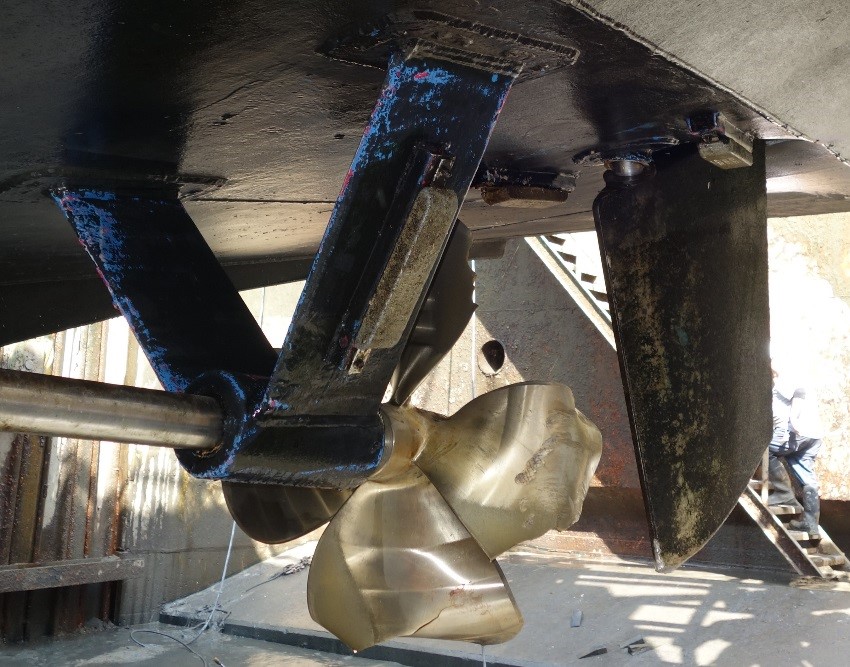 Le contact avec le fond a déformé la quille du navire du milieu jusqu’à la poupe, et a ouvert la coque près du milieu du navire. L’hélice de bâbord a été endommagée (figure 3), tout comme son arbre porte-hélice et le support d’arbre. Le gouvernail de bâbord a été repoussé vers l’arrière, de manière à tordre la mèche de gouvernail de bâbord et à déformer la coque autour de celle-ci. Le dessus du gouvernail de bâbord a également perforé la coque à la hauteur du compartiment de l’appareil à gouverner, ouvrant une brèche en forme de « L » mesurant environ 20 cm sur 40 cm et enfonçant d’environ 15 cm vers le haut le bordé extérieur (figure 4). Des raidisseurs de coque voisins ainsi que la cloison qui sépare le compartiment de l’appareil à gouverner et le compartiment de rangement arrière ont aussi été endommagés.