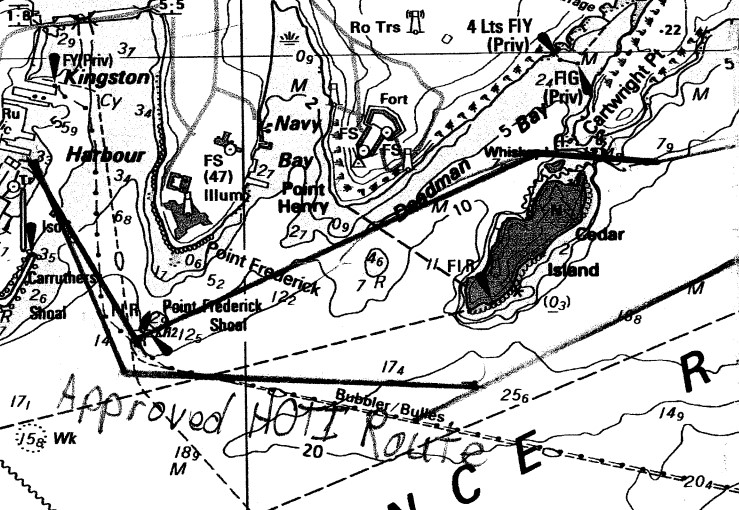 Route approuvée par la compagnie (trait noir continu) empruntant la baie Deadman et retour en passant au sud de l’île Cedar, tracée sur la carte 1439 du Service hydrographique du Canada. Source : Kingston & The Islands Boat Lines Ltd.