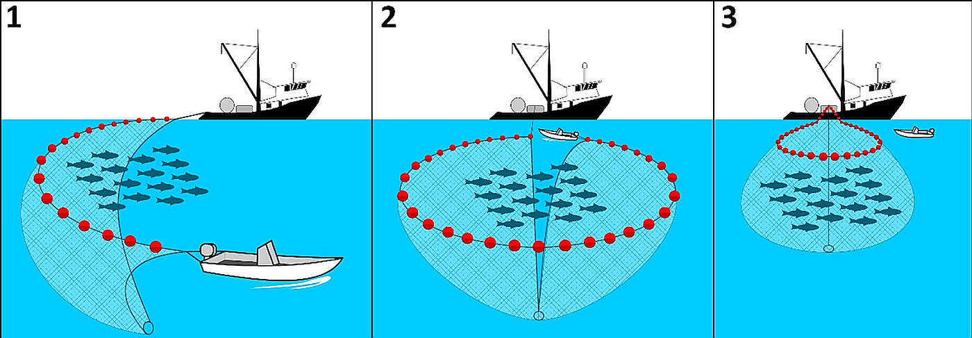 - On referme le fond du filet depuis le bateau de pêche pour ainsi créer une « senne » pour piéger le poisson.