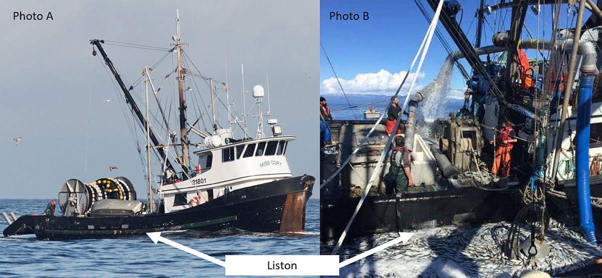 Le Proud Venture a ensuite communiqué avec le bateau collecteur Pacific Joye, qui se trouvait dans les environs; le Pacific Joye est venu en abord du Proud Venture vers 12 h 30. À bord du Proud Venture, on s'est servi de la pompe à poisson pour transférer environ 100 tonnes de hareng, principalement depuis le dessus de l'amas de poisson concentré dans la senne fermée en poche, à bord du Pacific Joye. Vers 13 h 45, après que le Proud Venture eut terminé de charger le Pacific Joye, le Miss Cory a gîté sur tribord de façon prononcée à cause du poids du poisson dans la senne. Afin de stabiliser le bateau et réduire sa gîte, on a chargé environ 40 tonnes de poisson dans ses cales avant, poids qui a enfoncé le liston du bateau (figure 3) dans l'eau. Aucun autre bateau collecteur n'était immédiatement disponible pour aider le Miss Cory. Vers 15 h, l'équipage a commencé à transférer le poisson à bord du Proud Venture. À ce stade, le poisson s'était déposé au fond de la senneNote de bas de page 9 . On a ajouté à la pompe un segment de boyau que l'on a descendu au fond de la senne pour atteindre le poisson.