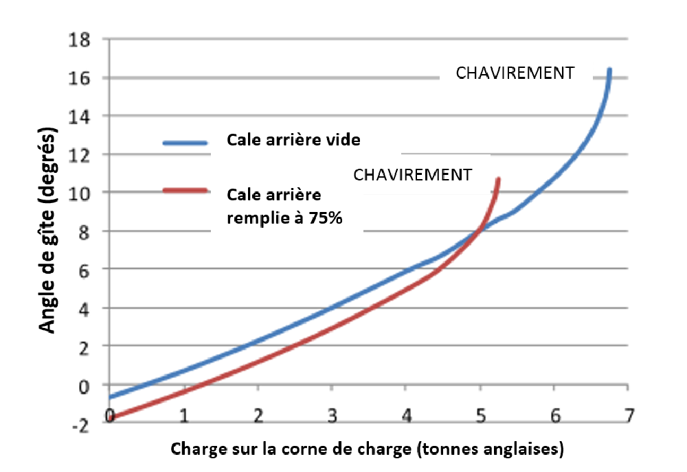 - Le poids suspendu à la corne de charge, de pair avec l'envahissement progressif par le haut des compartiments du bateau (notamment la cale arrière), a fait gîter et chavirer le bateau.