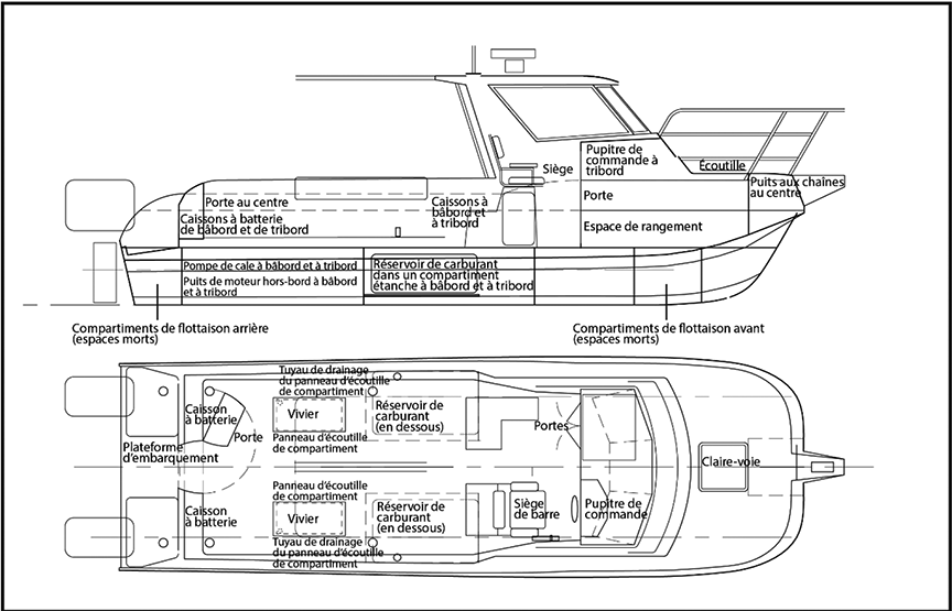 Sous le pont principal, il y a 2 compartiments de flottabilité à la proue et 2 autres à la poupe, à bâbord et à tribord; ils permettent au bateau de se maintenir à flot, à la ligne de flottaison, même lorsque remplis d'eau (annexe A)Note de bas de page 2 . Il y a également sous le pont principal, entre le tableau arrière et l'arrière des emménagements (à l'avant du bateau) 4 compartiments de coqueNote de bas de page 3 : tribord et bâbord avant, tribord et bâbord arrière. Une cloison étanche sépare les compartiments de coque arrière des compartiments de flottabilité arrière.