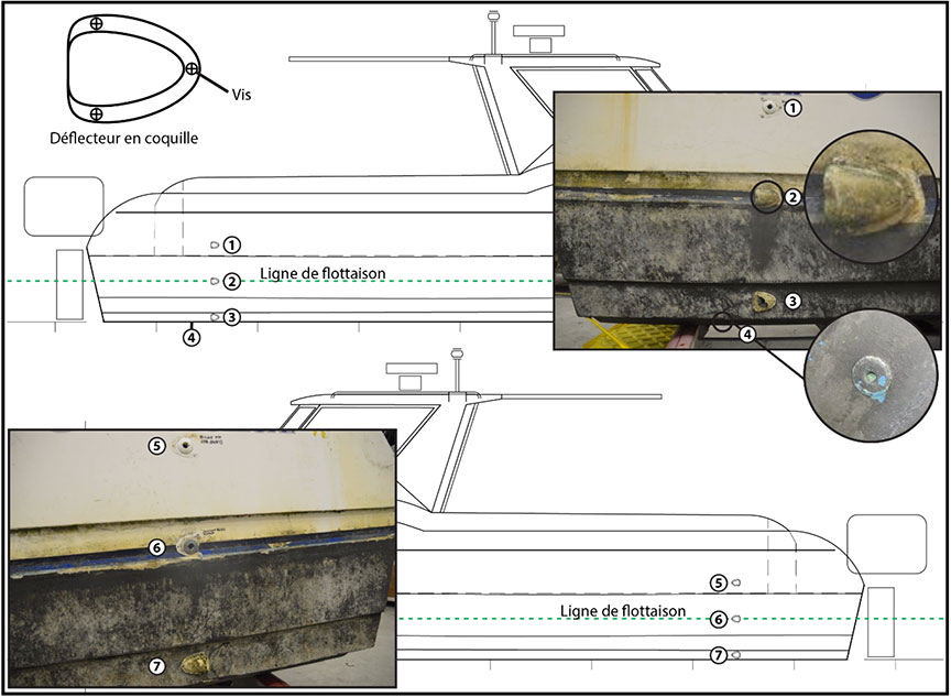 À un moment donné, 6 déflecteurs en coquille avaient été installés sur 5 orifices d'évacuation et 1 orifice de prise d'eau de la coque extérieure au poste de poupe du bateau. Chaque déflecteur était fixé par 3 vis. Toutes ces vis de fixation pénétraient la coque. Le déflecteur de l'orifice d'évacuation de la gouttière du panneau d'écoutille de compartiment de coque de bâbord et ses vis de fixation manquaient. Comme le déflecteur était vis-à-vis des tangons, il est probable qu'il ait été arraché avec le temps par les lignes de pêche.