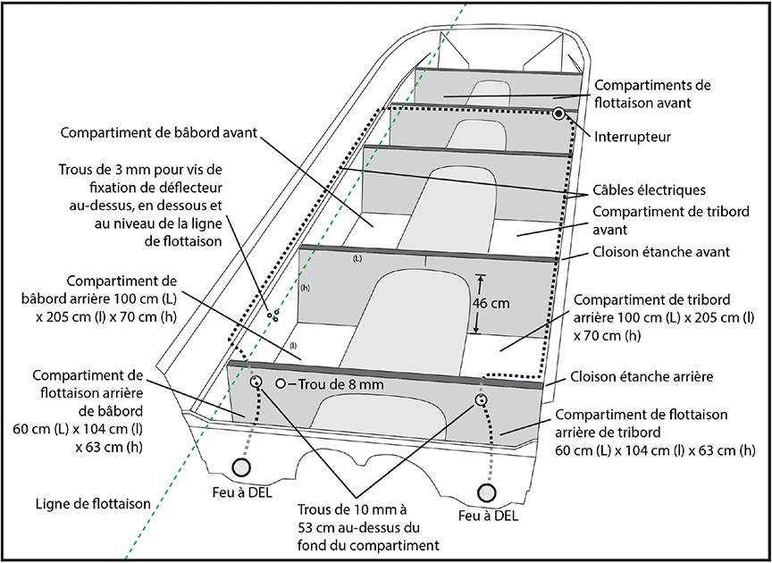 Deux câbles électriques passent par des trous percés dans la cloison étanche des compartiments de flottabilité arrière. Ces câbles sont reliés à des feux à diodes électroluminescentes (DEL) installés sur l'extérieur de la carène arrière, de chaque côté du bateau (annexe C).