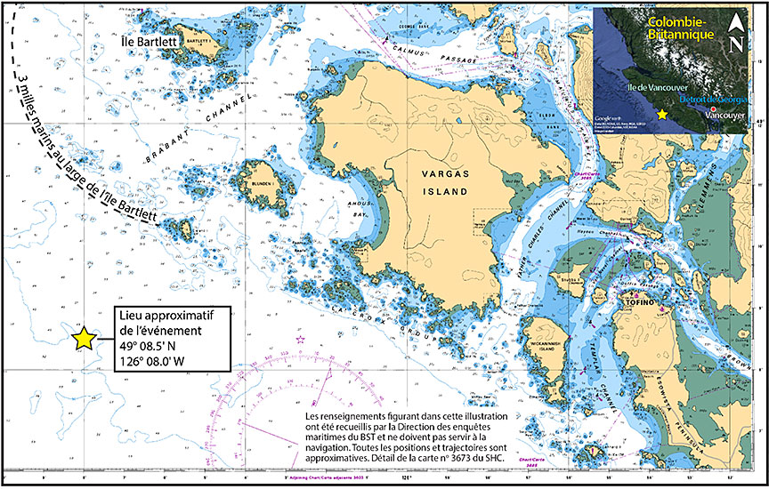 À 13 h 15, le conducteur a utilisé le téléphone cellulaire pour appeler la station de bateaux de sauvetage de la Garde côtière canadienne (GCC) à Tofino afin de signaler la situation d'urgence. Le conducteur a indiqué qu'il se trouvait à 3 nm de l'île BartlettNote de bas de page 8 . La position réelle du bateau était 49°08.5' N, 126°08.0' W (annexe D).