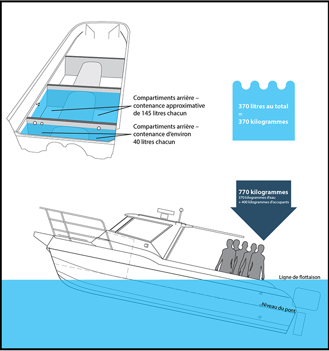 Le conducteur et les passagers qui étaient à l'arrière pour écoper l'eau du vivier de bâbord ont encore ajouté du poids, ce qui a enfoncé la poupe jusqu'au niveau de l'eau. Avec les paquets de mer qui embarquaient, la situation a fait que le pont s'est rempli d'eau, et elle a contribué à l'immersion de la poupe (annexe H). Le bateau a fini par ne plus pouvoir demeurer à l'horizontale. Tous les occupants ont alors abandonné le bateau et se sont retrouvés à l'eau.
