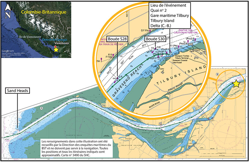 Au moment où le navire se trouvait à environ 3 milles marins de Sand Heads (annexe B), le premier officier a indiqué à la salle des machines de se préparer à l'arrivée. La gouverne du navire est passée du pilote automatique à la roue de gouvernail, que commandait le matelot de pont. À ce moment, la vitesse du navire était de 16 nœuds, et l'équipe à la passerelle comprenait le capitaine de relève, le premier officier et un matelot de pont. Vers 15 h 9, le matelot de pont à la roue de gouvernail a été relevé par un autre matelot de pont, qui a continué de gouverner avec la barre à roue.