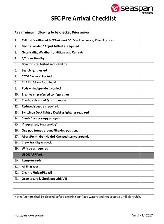 - On a dressé des listes de vérifications avant l'arrivée propre à chaque gare maritime (Tilbury, Swartz Bay et Duke Point), et révisé les étapes pour qu'elles comprennent des détails précis sur le moment de régler la commande d'appareil à gouverner aux volants de POD (annexe D).