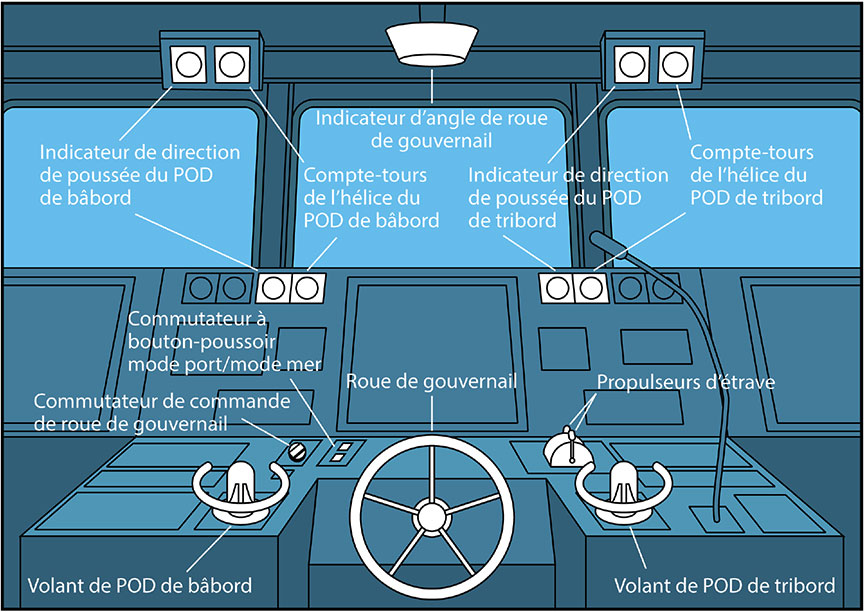 Les commandes de propulsion et d'appareil à gouverner se trouvent à la passerelle. Le navire est muni de 2 commandes manuelles d'appareil à gouverner : une barre à roue (ou roue de gouvernail) et des volants de POD. Le degré de rotation des POD varie selon le mode de fonctionnement sélectionné (port/mer) ou de commande de l'appareil à gouverner (barre à roue/POD)Note de bas de page 3. Le navire est également muni d'un pilote automatique.