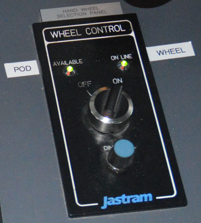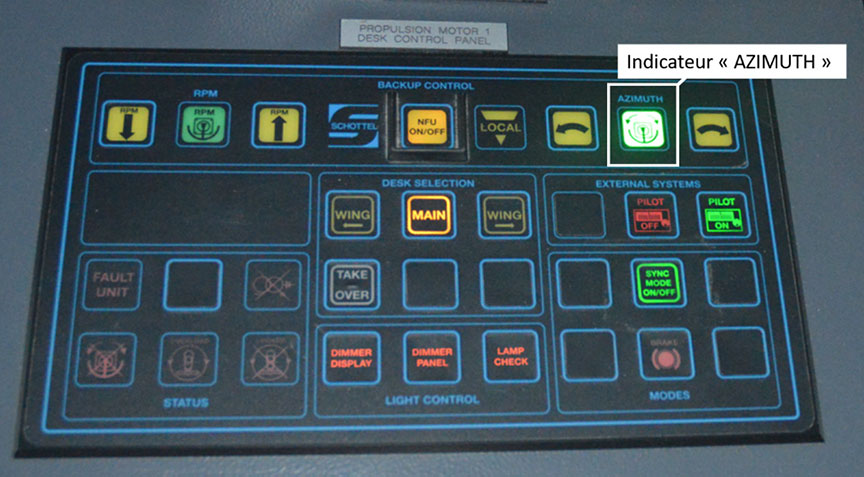 Le Seaspan Swift et son navire-jumeau, le Seaspan Reliant, ont été conçus à l'origine avec 2 types de commandes manuelles d'appareil à gouverner : une roue de gouvernail (ou barre à roue) et des volants de POD. Les volants de POD, situés de part et d'autre du pupitre central de passerelle (figure 3), permettent d'orienter les POD indépendamment ou de façon synchroniséeNote de bas de page 15. Les POD peuvent pivoter horizontalement sur 360° dans les deux sens. Lorsque la commande d'appareil à gouverner est réglée aux volants de POD, un indicateur étiqueté « AZIMUTH » sur le panneau de commande de propulsion s'allume (figure 4).