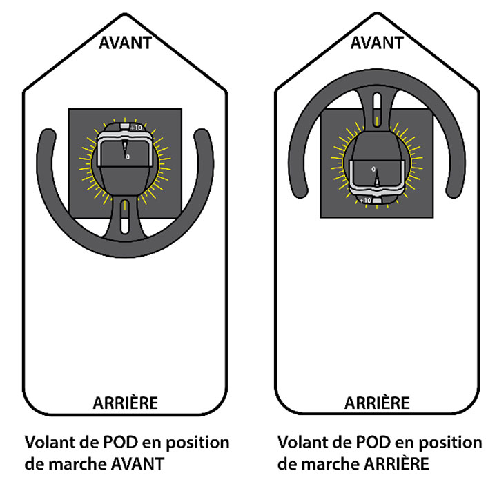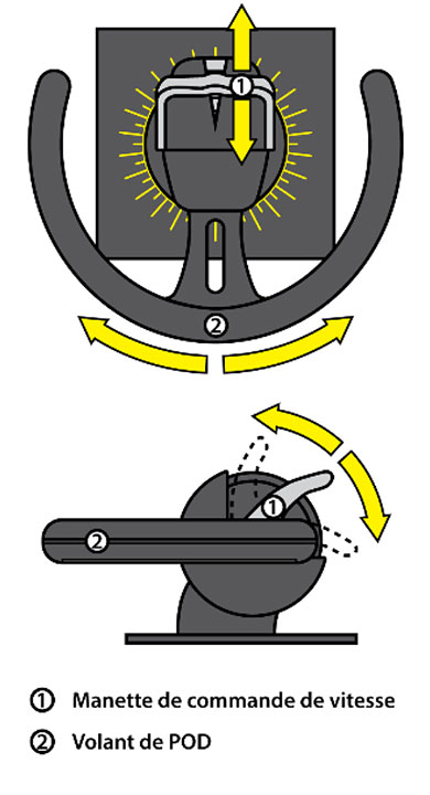 Les volants de POD comprennent des manettes pour augmenter ou diminuer la vitesse des hélices (figure 7 et figure 8). Ces manettes sont unidirectionnelles et peuvent se déplacer uniquement de 0° (situé au centre de la course de la manette) à un maximum de 90° (situé à 1 extrémité de la course de la manette). Les manettes de commande de vitesse sont le seul moyen pour l'opérateur d'augmenter ou de diminuer la propulsion du navire, peu importe s'il gouverne avec la roue de gouvernail ou avec les volants de POD. Les hélices tournent dans 1 sens uniquement.