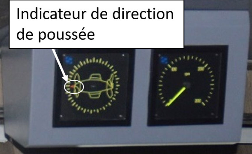 Il y a 4 groupes d'indicateurs à la passerelle pour afficher la direction de la poussée et les tours par minute des POD (figure 9). Deux d'entre eux se trouvent sur le pupitre principal près de chacun des volants de POD, et 2 autres se trouvent au-dessus des fenêtres avant de la passerelle (l'indicateur du POD de bâbord est du côté gauche, et celui de POD de tribord est du côté droit). Les indicateurs de direction de poussée affichent une échelle de rotation non graduée sur 360° et une image d'un POD à 2 hélices; un pointeur triangulaire rouge indique la direction de la poussée du POD (figure 9).