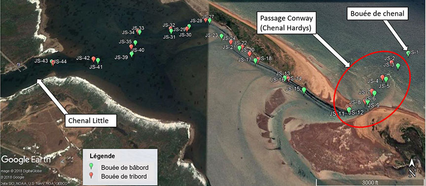 Au moment de l'événement, le programme Aides à la navigation de la GCC stipulait qu'un spécialiste en conception et examen effectue une visite des lieux tous les 5 ans pour évaluer les aides à la navigation dans l'ensemble du passage de la baie Malpeque et du chenal Hardys (figure 2). Le dernier examen remontait à 2008; on avait alors déterminé qu'aucune révision aux aides à la navigation n'était nécessaire.
