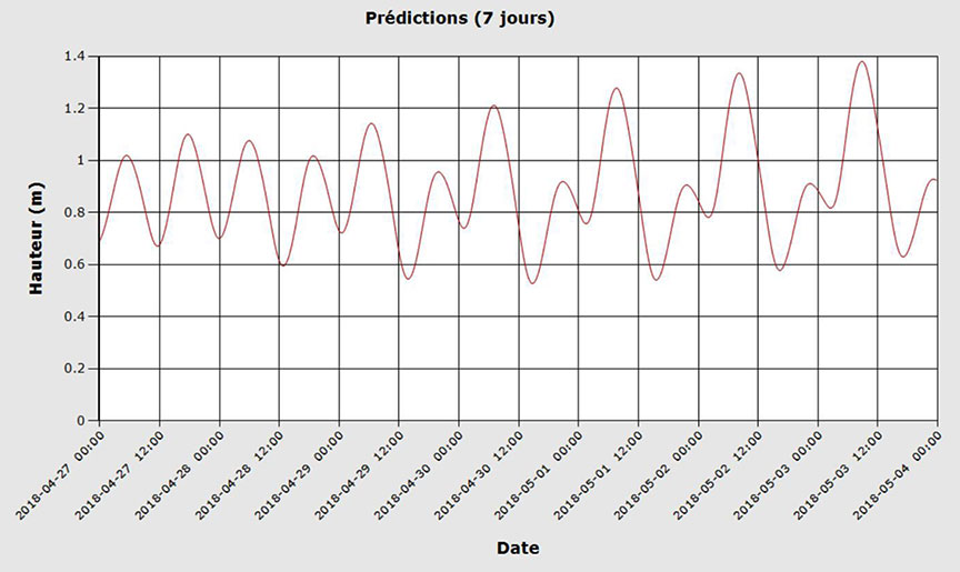 Le 30 avril 2018, il y avait pleine lune. Au printemps, les phases de pleine lune et de nouvelle lune donnent lieu aux marées de vives-eaux, qui génèrent de grandes différences de hauteur entre les marées hautes et basses quotidiennes. Le graphique ci-dessous illustre les marées à Ellerslie (Île-du-Prince-Édouard), le port de référence pour le chenal Hardys (figure 3).