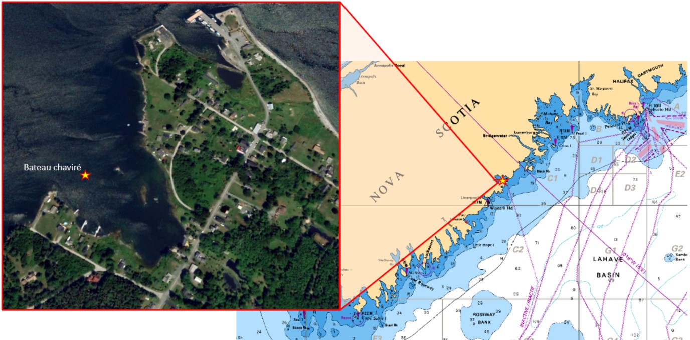 Peu après 10 h, la Gendarmerie royale du Canada (GRC) a reçu un appel qu’un petit bateau de pêche avait chaviré à 0,04 NM au nord-est de l’anse Beach, à Port Medway (Nouvelle-Écosse) (figure 2). Les habitants savaient que ce secteur était près de l’endroit où le capitaine du bateau de pêche entreposait ses casiers à crabes, signifiant qu’il s’agissait probablement de son bateau. La GRC a appelé le Centre conjoint de coordination des opérations de sauvetage – Halifax, et une opération de recherche a été lancée. L’opération de recherche était menée par la GRC, une embarcation rapide de sauvetage du service d’incendie de Liverpool, une embarcation rapide de sauvetage du ministère des Pêches et des Océans, un bateau de pêche local, un hélicoptère du Centre conjoint de coordination des opérations de sauvetage, un aéronef à voilure fixe de la 14e Escadre Greenwood (Nouvelle-Écosse) et une équipe de recherche et de sauvetage terrestre locale composée de membres de la collectivité.
