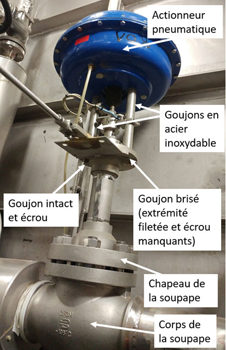 La pièce défaillante de la soupape était 1 des 2 goujons en acier inoxydable qui retiennent l'actionneur pneumatique sur le chapeau de la soupape (figure 2).