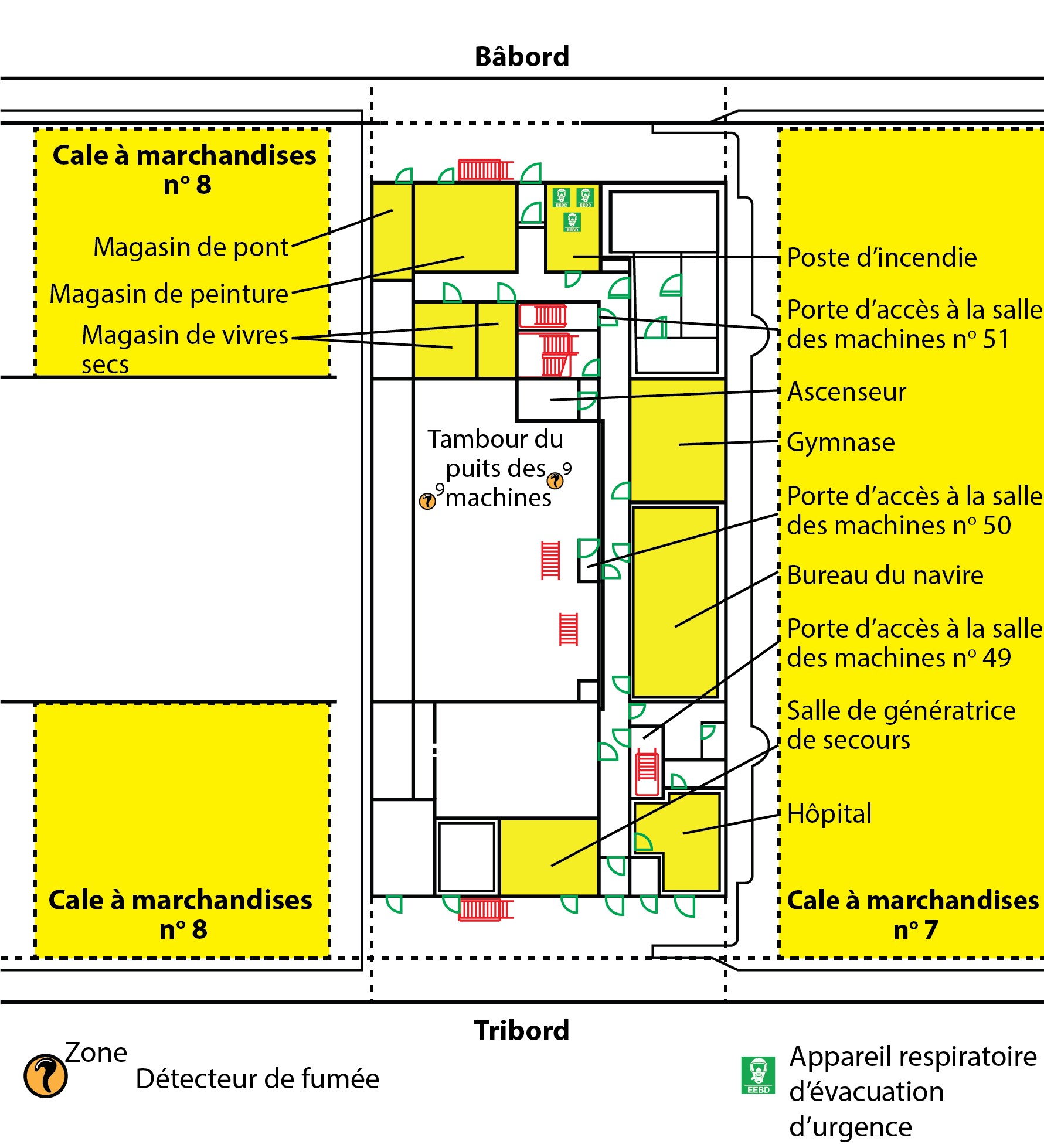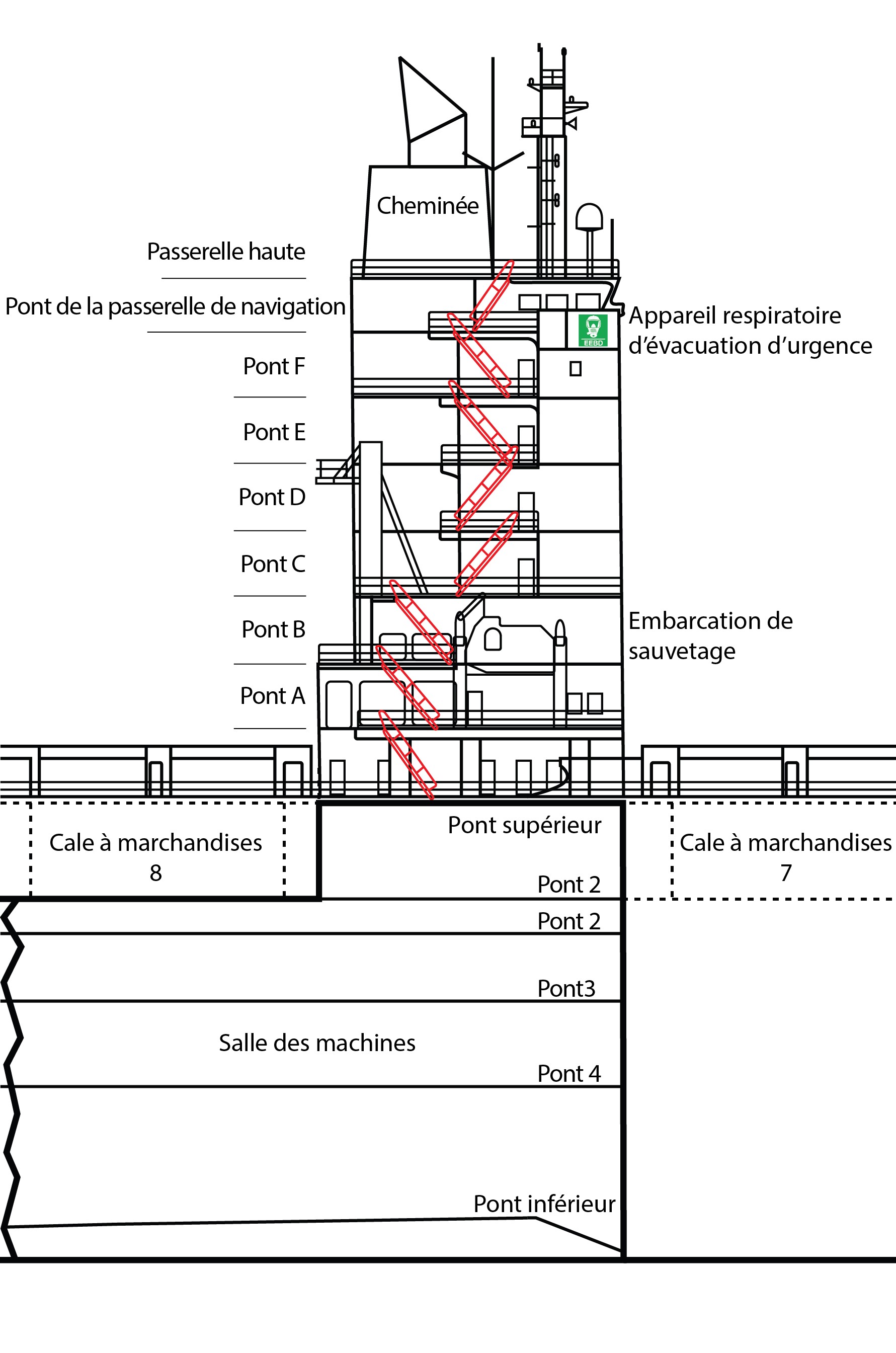 Les emménagements du pont supérieur comprennent le bureau du navire, le poste d’incendie, l’hôpital, la génératrice de secours, de même que 3 portes (portes 49, 50 et 51), dans la superstructure, s’ouvrant sur des escaliers qui descendent à la salle des machines (figure 3).