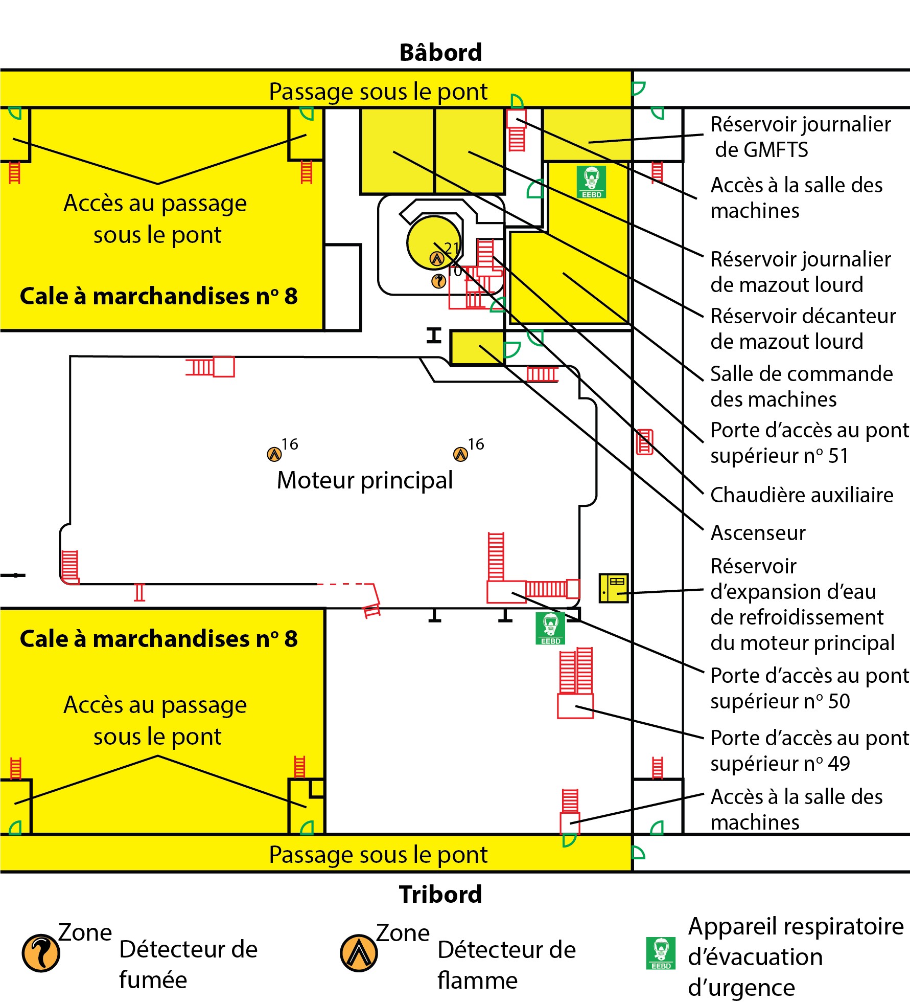 Le capitaine en second a ordonné au nettoyeur de récupérer les 2 AREU du poste d’incendie et à un matelot portant une combinaison de pompier d’apporter les AREU en bas, à la SCM. Le matelot transportant les 2 AREU a ouvert la porte 51 et commencé à descendre l’escalier, mais il a rencontré une épaisse fumée qui l’a empêché d’atteindre la salle des machines et l’a forcé à retourner au pont supérieur. Le capitaine en second a alors demandé à d’autres membres d’équipage se trouvant au poste de rassemblement d’entrer dans la salle des machines. Tous ont refusé de le faire. Pendant ce temps, le troisième mécanicien a démarré la pompe d’incendie d’urgence du poste d’incendie. Le capitaine en second a ordonné au troisième mécanicien et à l’officier électrotechnicien de se rendre à la pompe pour vérifier si elle fonctionnait adéquatement et produisait la pression nécessaire.