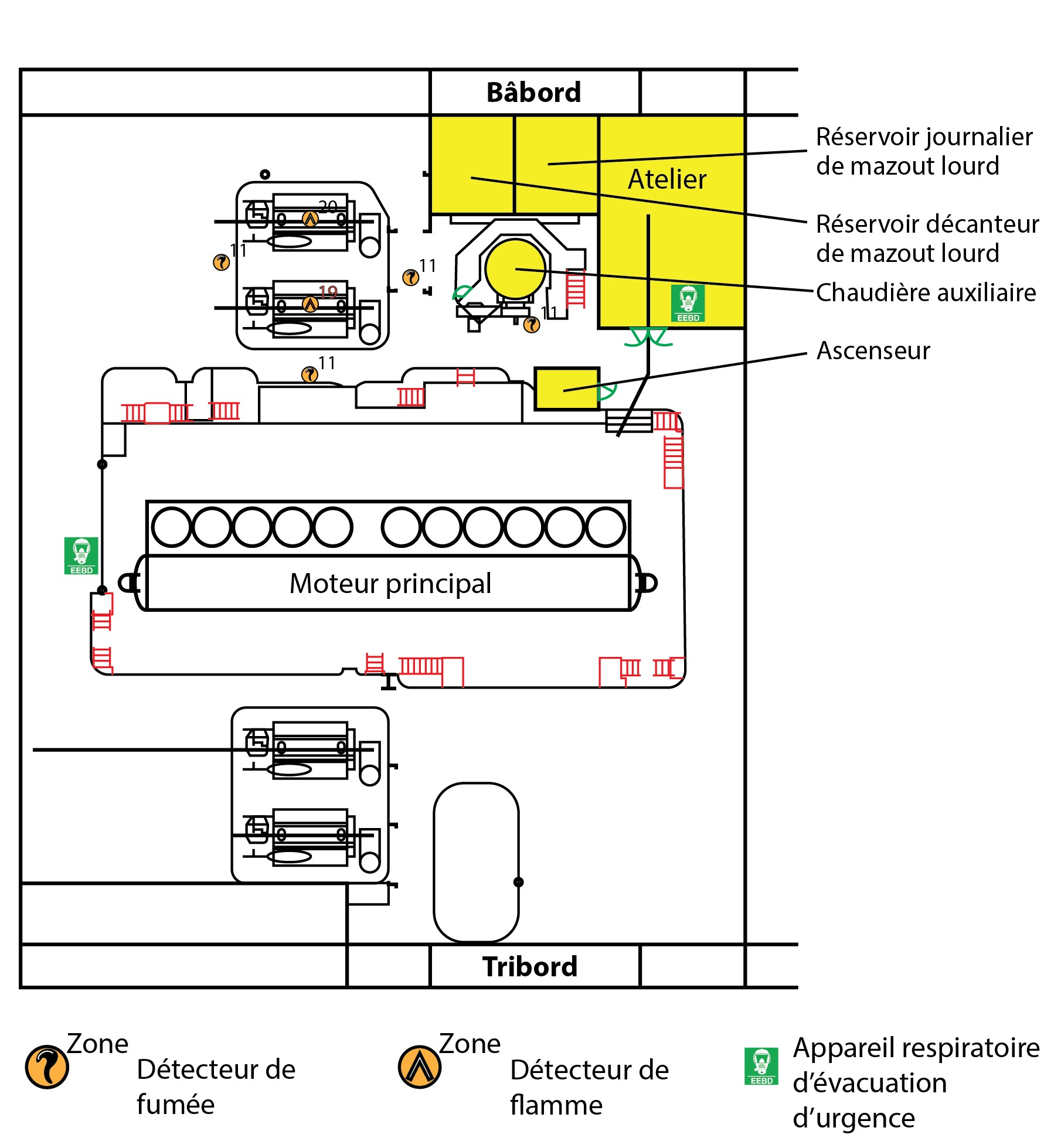 - Divers facteurs (p. ex., conception de la salle de commande des machines; emplacement et disponibilité de l’équipement de sécurité et connaissance qu’en a l’équipage; membres piégés devant jouer des rôles clés dans la lutte contre les incendies) se sont combinés pour compliquer la sortie de la salle de commande des machines et les efforts d’évacuation subséquents, ce qui a posé des risques pour l’équipage pendant l’intervention d’urgence et retardé la sortie du personnel piégé.