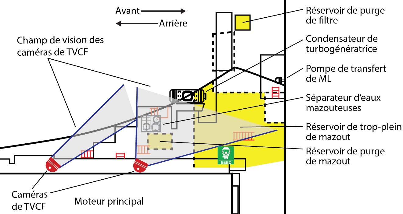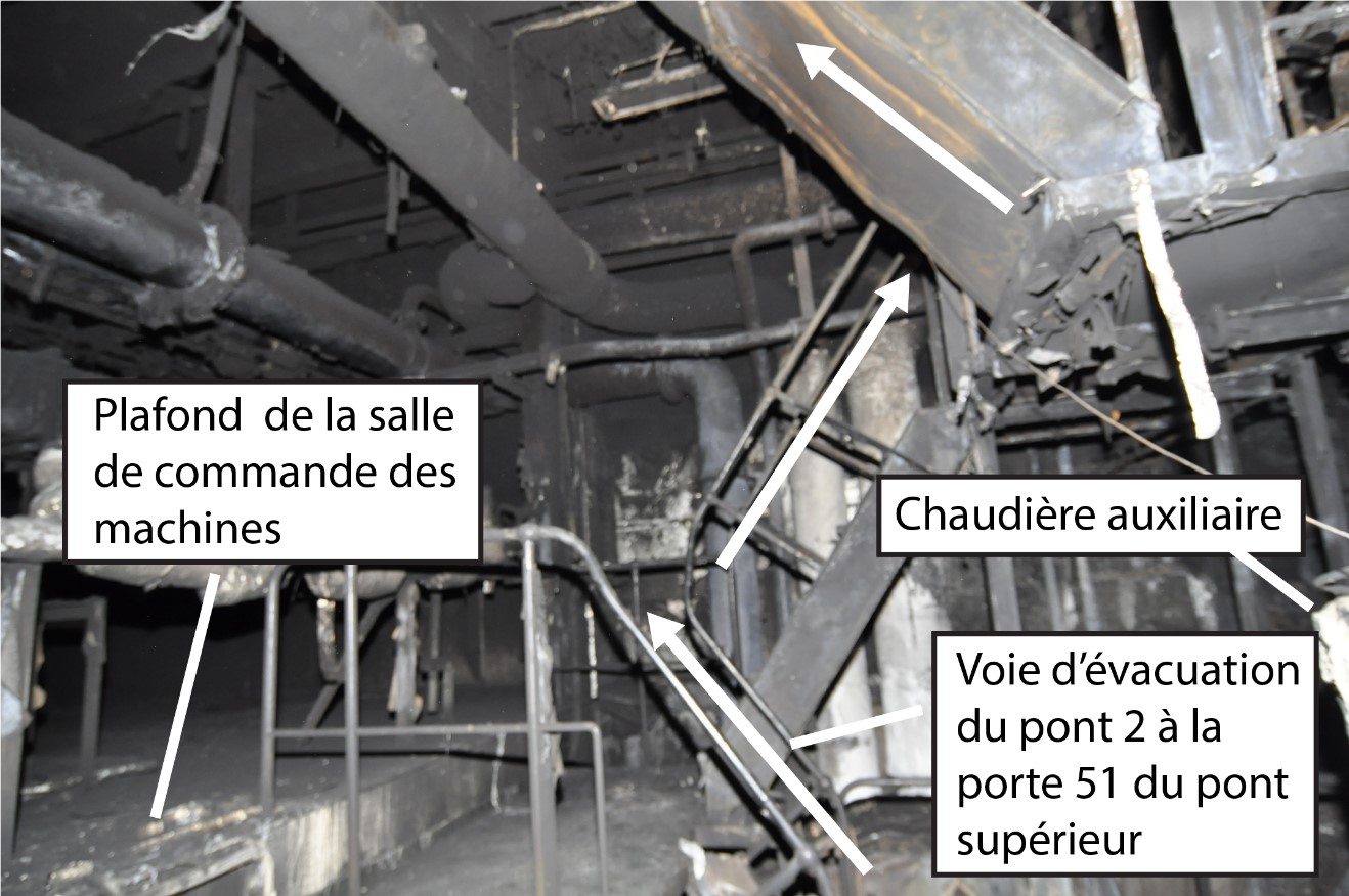 Entre-temps et après que le reste de l’équipe était entré dans la SCM, le chef mécanicien est arrivé à la salle des machines par l’ascenseur et y est entré par la porte de tribord la plus proche de l’ascenseur. Il n’y a remarqué aucune fumée ni vapeur. L’ascenseur est alors retourné au pont supérieur. Une fois dans la SCM, le chef mécanicien a regardé par la fenêtre de tribord de la cloison de la SCM et constaté que la visibilité du côté tribord de la salle des machines était bonne. Le chef mécanicien et l’équipe de la salle des machines se trouvant dans la SCM ont alors discuté de l’alarme d’incendie et de l’origine des vapeurs blanches.
