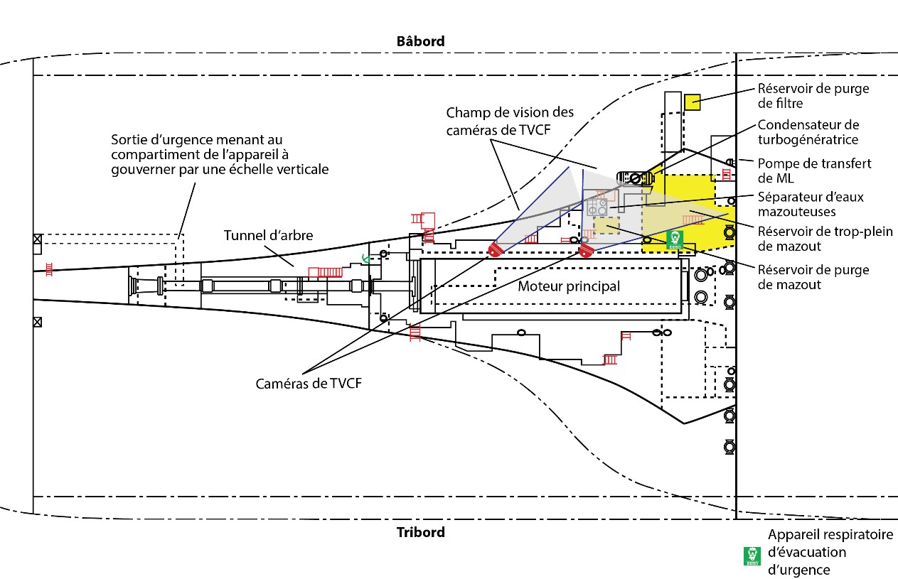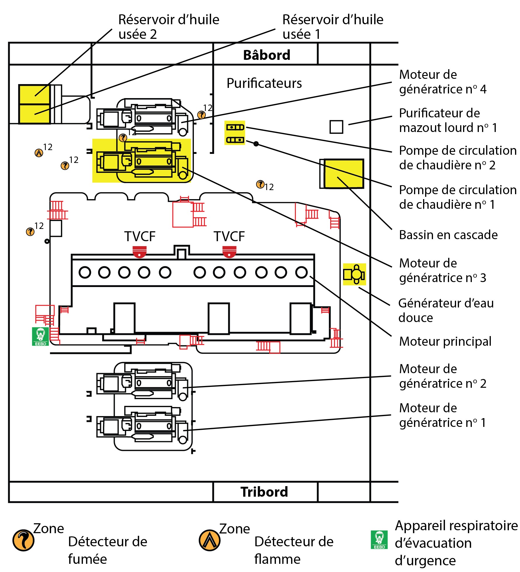 Peu après, le reste de l’équipe de la salle des machines (soit le quatrième mécanicien, le mécanicien subalterne, ainsi que les machinistes 1 et 2) se sont rendus à la SCM. Dans l’intervalle, des vapeurs ont été remarquées derrière le puits d’ascenseur, de même que des vapeurs blanches, au-dessus des moteurs de génératrice 3 et 4.