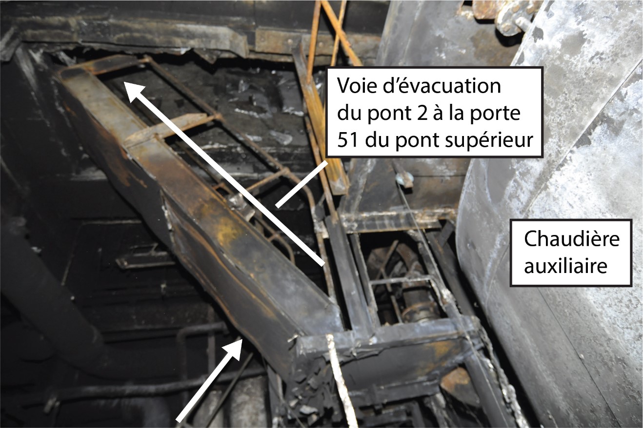 La sortie et l’évacuation rapides d’une salle des machines sont essentielles quand un incendie s’y déclare. Dans l’événement à l’étude, le personnel de la salle des machines s’est réuni dans la salle de commande des machines quand l’incendie s’est déclaré, mais s’y est trouvé piégé quand l’incendie s’est intensifié. De nombreux facteurs se sont combinés pour compliquer la sortie de la salle de commande des machines et les efforts d’évacuation subséquents, ce qui a posé des risques pour l’équipage pendant l’intervention d’urgence et retardé la sortie du personnel piégé. Pendant ce temps, l’incendie continuait de brûler.