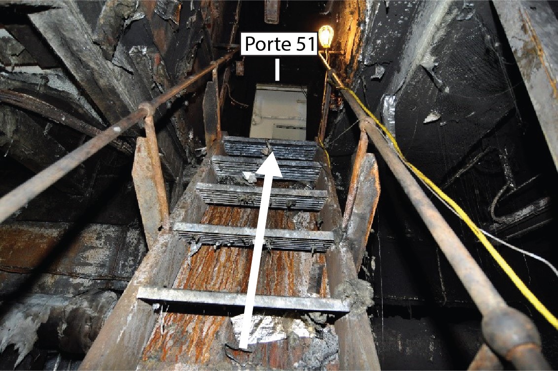 À 21 h 38, 3 des 6 membres d’équipage se trouvant dans la SCM ont enfilé un AREU et suivi le capitaine en second hors de la salle des machines à l’aide de la ligne de sécurité fixée au capitaine en second. Pendant que ces 4 membres d’équipage montaient l’escalier (figures 9, 10 et 11), ils ont rencontré une fumée dense et de la chaleur issues de l’incendie. Le capitaine en second a trébuché dans l’escalier et s’est brûlé la paume des mains en saisissant la rampe pour rattraper son équilibre. Le chef mécanicien a également trébuché dans l’escalier et s’est brûlé les bras en entrant en contact avec les rampes. Le deuxième mécanicien a subi des brûlures similaires aux paumes et aux avant-bras. Le quatrième mécanicien a glissé et s’est heurté la tête, ce qui a délogé son AREU et lui a causé des brûlures aux oreilles.