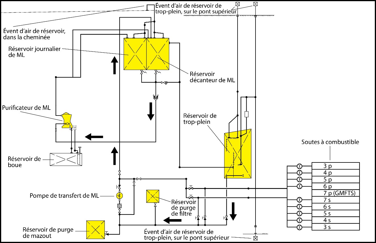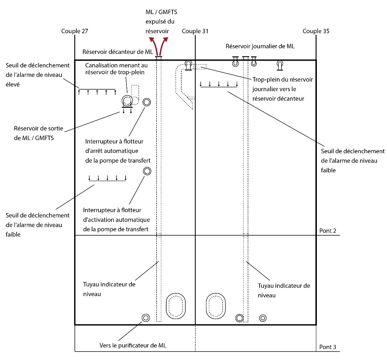 Le pont inférieur renferme des caisses d’huile usée, des caisses de purge, un réservoir de trop-plein de mazout, un séparateur d’eaux mazouteuses et des pompes de transfert de mazout (figure 8). Il est accessible au moyen d’escaliers qui descendent depuis le pont 4. Une sortie d’urgence mène du pont inférieur jusqu’au local de l’appareil à gouverner, en passant par le tunnel d’arbre.