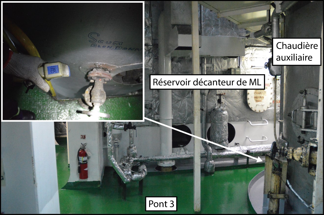 Peu après, le quatrième mécanicien s’est rendu à la caisse de décantation du pont 3 pour vérifier la température indiquée sur l’instrument local; ce dernier montrait 120 °C. Le quatrième mécanicien s’est ensuite rendu à la SCM au pont 2, où une alarme de température élevée de l’entrée du purificateur sonnait sur le panneau d’alarme de la salle des machines.