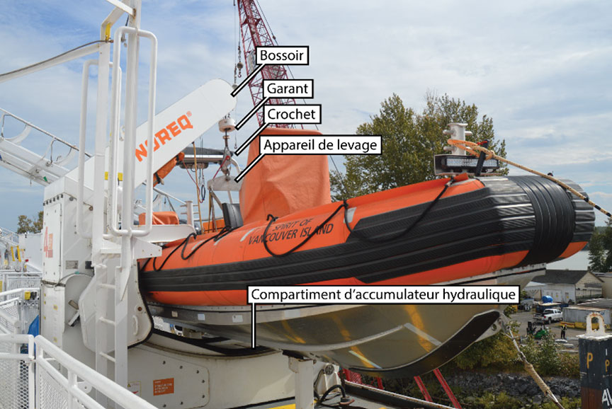 Durant les travaux de diagnostic, le technicien a informé le matelot de pont qu’il allait charger d’azote l’accumulateur hydraulique. Afin de permettre au technicien d’accéder au compartiment d’accumulateur, le matelot de pont a abaissé le canot de secours jusqu’à la surface de l’eau et a relâché le garant de quelque 75 cm à 100 cm avant de relever le bossoir à sa hauteur maximale. Pendant que le technicien chargeait d’azote l’accumulateur hydraulique, le canot de secours inoccupé flottait sur l’eau, le garant relâché; la manille de levage et le crochet reposaient sur le dessus du réservoir de carburant. Le processus a duré environ 20 minutes.