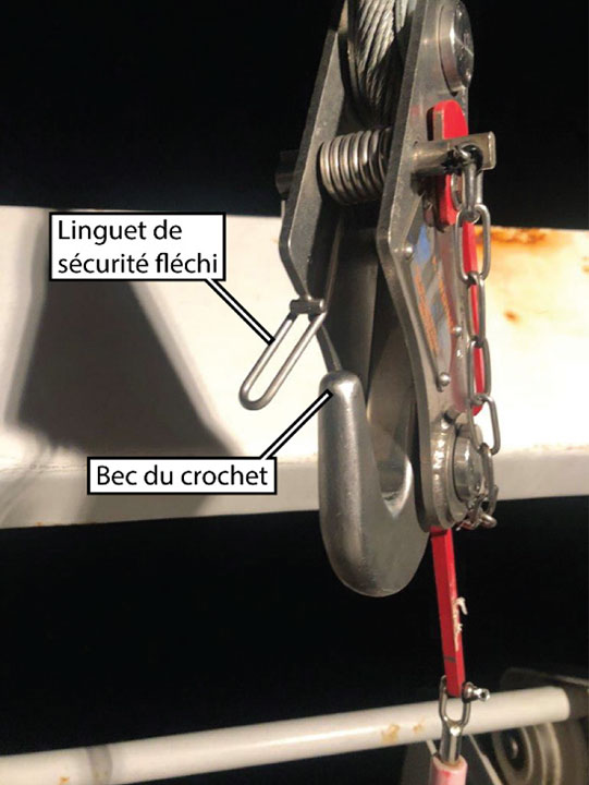 Cette mesure temporaire avait pour objectif de réduire le risque. En pratique, toutefois, elle a fait qu’il était impossible pour l’équipage de vérifier que la manille de levage était bien positionnée sur le crochet, à partir du poste de manœuvre du bossoir et à la noirceur. D’après le Centre canadien d’hygiène et de sécurité au travail, avant de déplacer une charge, l’opérateur doit s’assurer que le dispositif de levage repose bien au creux de la selle du crochetNote de bas de page 3.