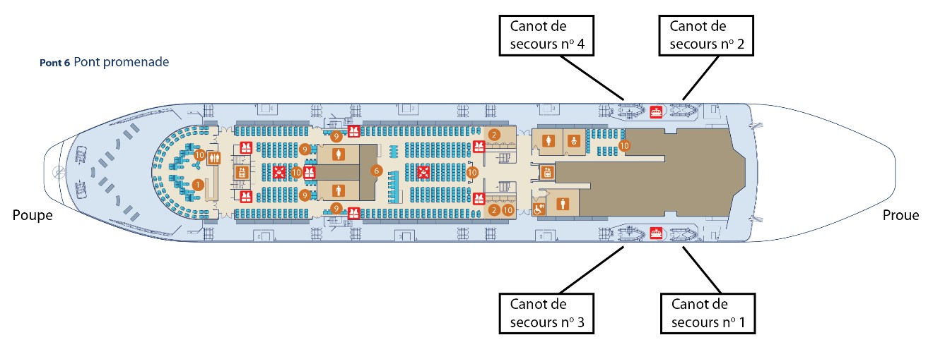 - Pont 6 : pont promenade pour les passagers avec 4 canots de secours (2 à tribord, 2 à bâbord; voir la figure 2). Le pont 6 se situe à environ 14 m de la ligne de flottaison.