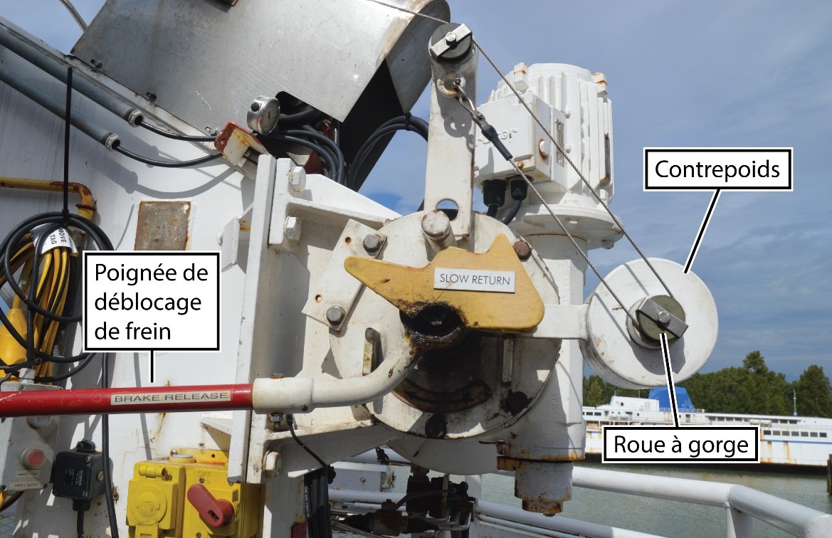 Le câble de déblocage de frein de chaque canot de secours est un câble en nylon orange relié à un câble métallique. Ce câble métallique file du côté intérieur de la potence de bossoir sur des roues à gorge, s’enroule sur une autre roue à gorge montée sur le contrepoids du système de déblocage de frein, puis est fixé à un piton sur le bossoir. Lorsque le barreur tire sur le câble de déblocage de frein, le contrepoids se soulève et débloque le frein du bossoir. Une fois le frein débloqué, le canot de secours descend à l’eau de façon contrôlée par un frein centrifuge, à raison d’environ 1 m par seconde. Lorsqu’on cesse de tirer sur le câble de déblocage du frein, le contrepoids redescend et le frein se bloque à nouveau.