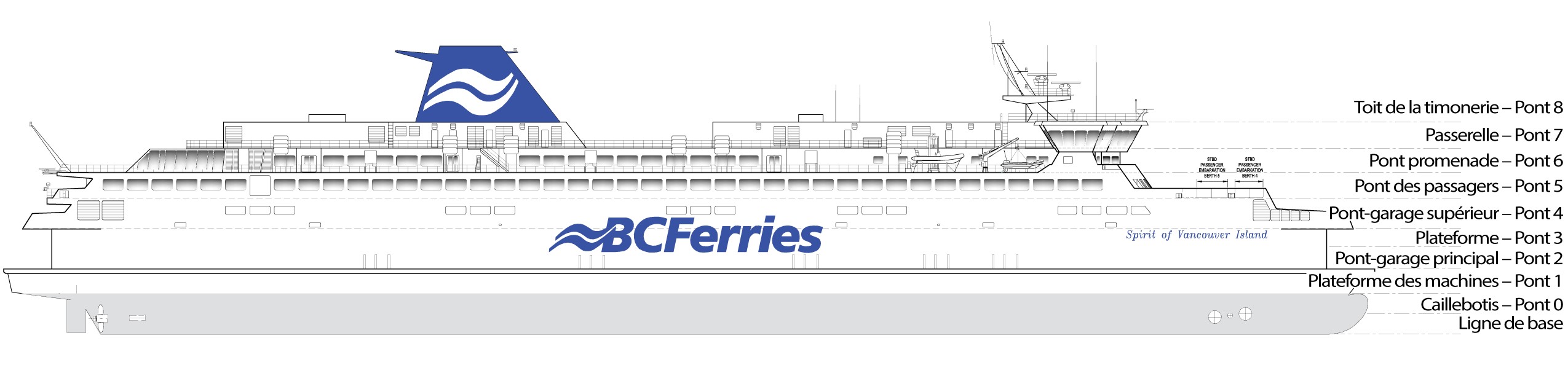 Le Spirit of Vancouver Island (figure 1) est un navire à coque en acier qui compte 8 ponts. Il appartient à la British Columbia Ferry Services Inc. (BC Ferries), qui en assure également l’exploitation. Sa capacité maximale est de 2059 passagers, 470 véhicules et 41 membres d’équipage.