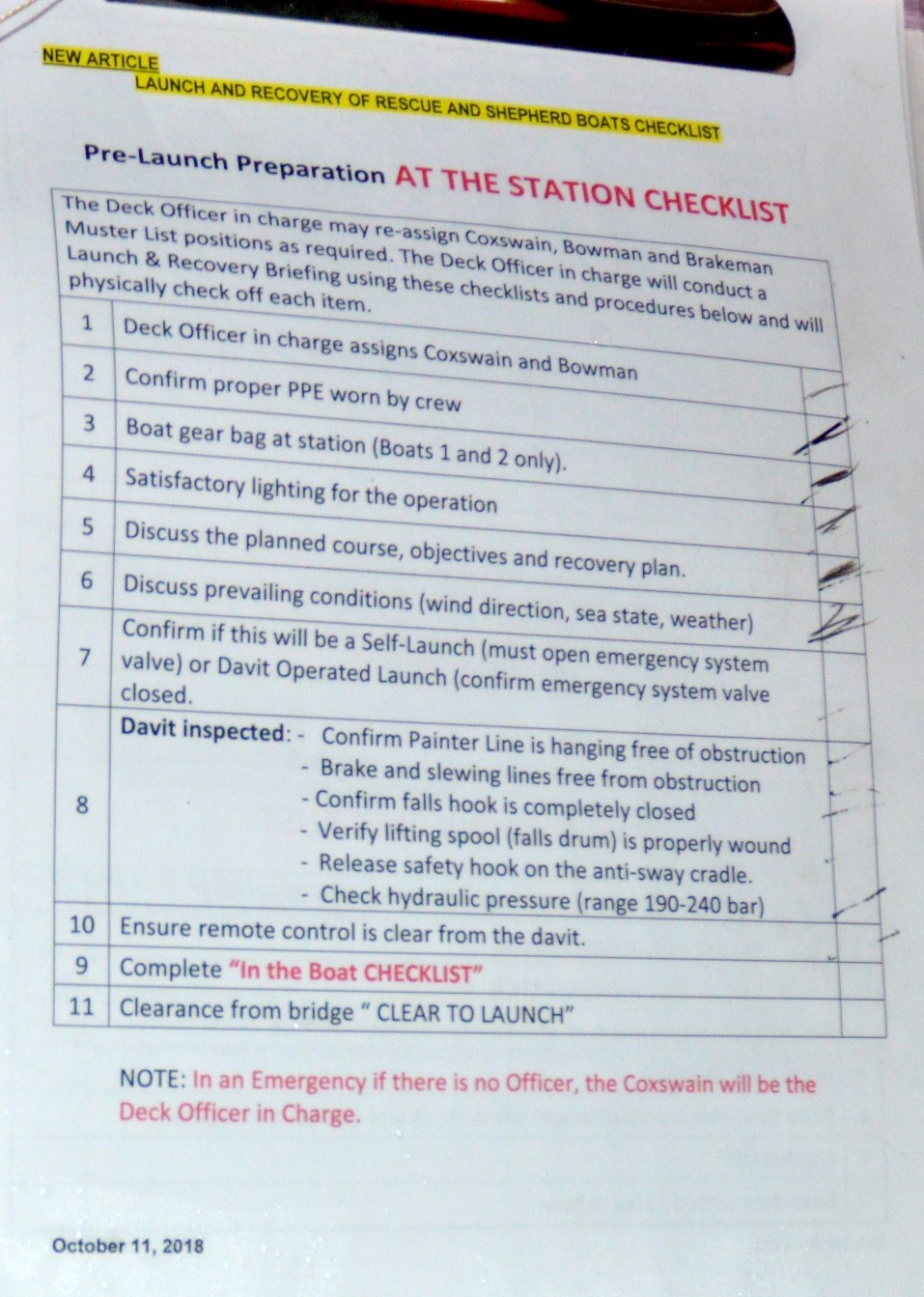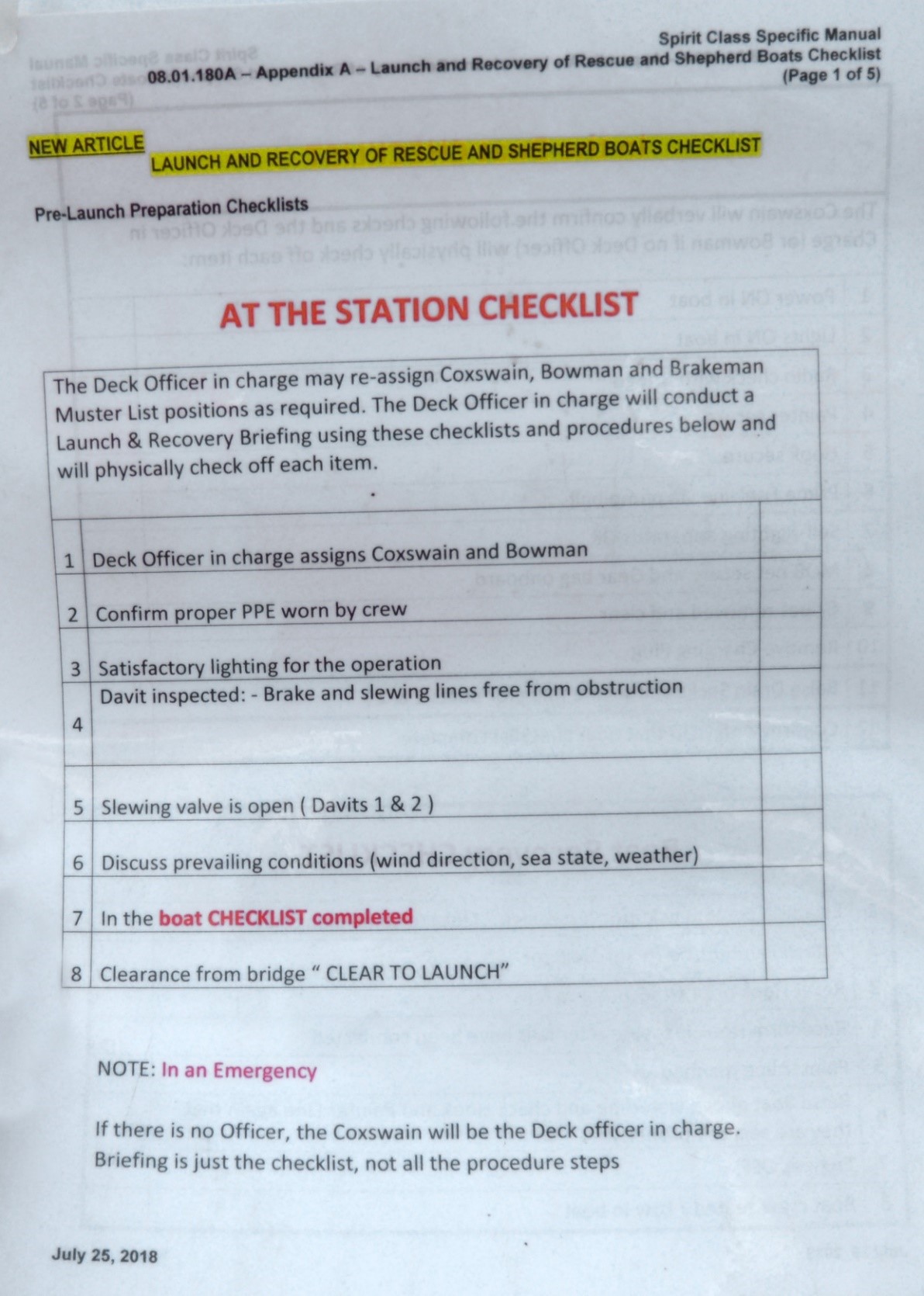 Source : Spirit Class Specific Manual, 08.01.180A, annexe A : Launch and Recovery of Rescue and Shepherd Boats Checklist (11 octobre 2018).