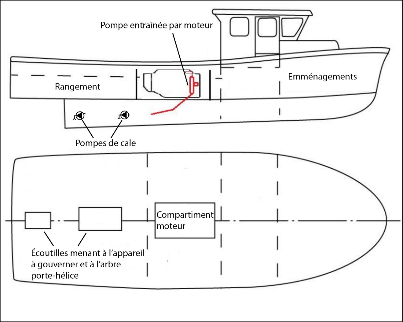 Le bateau était équipé de 2 pompes de cale électriques et de 1 pompe entraînée par moteur. L’une des pompes de cale était située à l’avant, dans le compartiment moteur, et était programmée pour s’actionner automatiquement si elle était déclenchée par un interrupteur à flotteur dans la cale. L’autre pompe de cale était située à l’arrière, dans la cambuse, et était actionnée manuellement par un interrupteur dans la timonerie. La pompe entraînée par moteur était située dans le compartiment moteur (annexe A). Elle était conçue pour être utilisée comme pompe à incendie pour offrir un soutien aux autres navires, mais était généralement utilisée comme pompe de lavage pour nettoyer le pont; elle pouvait également être utilisée pour pomper la cale.