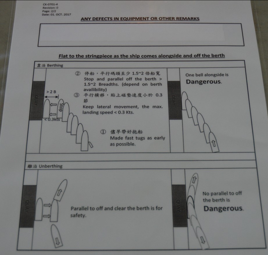 L’arrière de la fiche de pilotage comprenait de brèves directives pour s’approcher d’un poste d’accostage et pour le quitter (figure 2). Selon les directives, pour accoster, le navire devait être immobilisé parallèlement au poste d’accostage, à une distance d’environ 1,5 à 2 largeurs de navire (de 64 à 86 m). Les remorqueurs devaient s’amarrer le plus rapidement possible, et le navire devait être manœuvré latéralement vers le poste d’accostage à une vitesse d’accostage maximale inférieure à 0,3 nœud (15,4 cm/s). Les directives mettaient également en évidence les manœuvres d’accostage et d’appareillage considérées comme étant dangereuses pour ce navire précis.