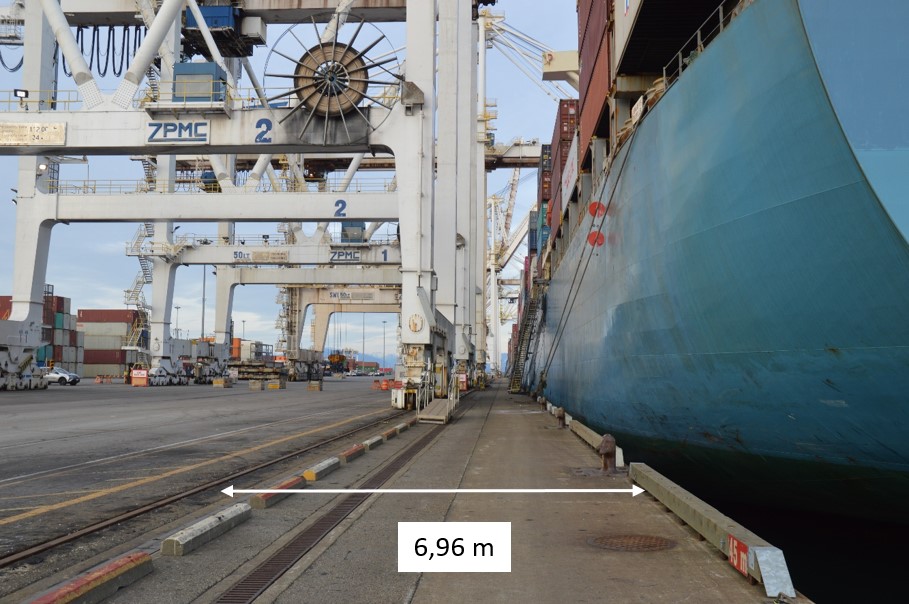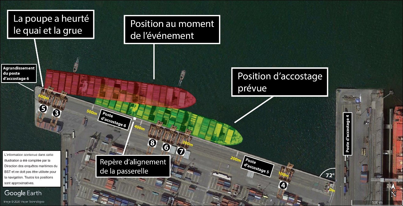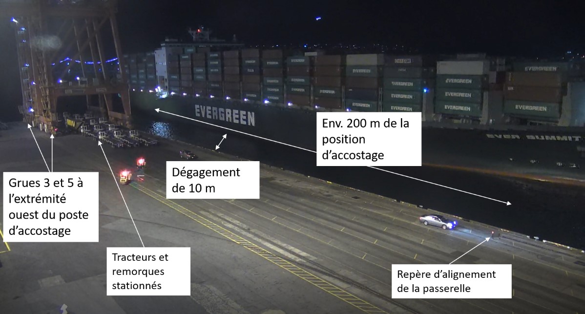 Deux grues portiques (les grues portiques 3 et 5) étaient positionnées à l’extrémité ouest du poste d’accostage (près de la marque de 600 m), 3 grues portiques étaient positionnées au milieu du poste d’accostage (près de la marque de 300 m) et la dernière grue portique était positionnée à l’extrémité est (près de la marque de 80 m)Note de bas de page 20.