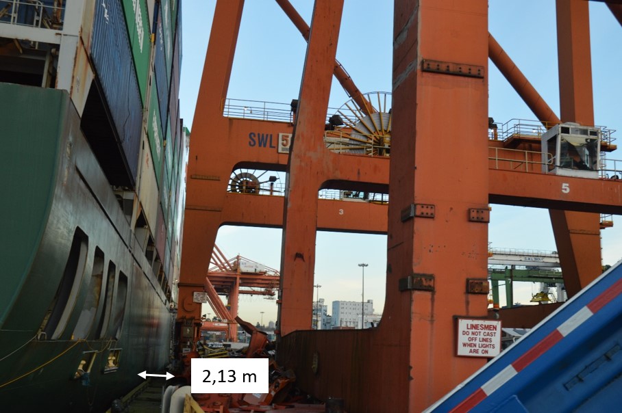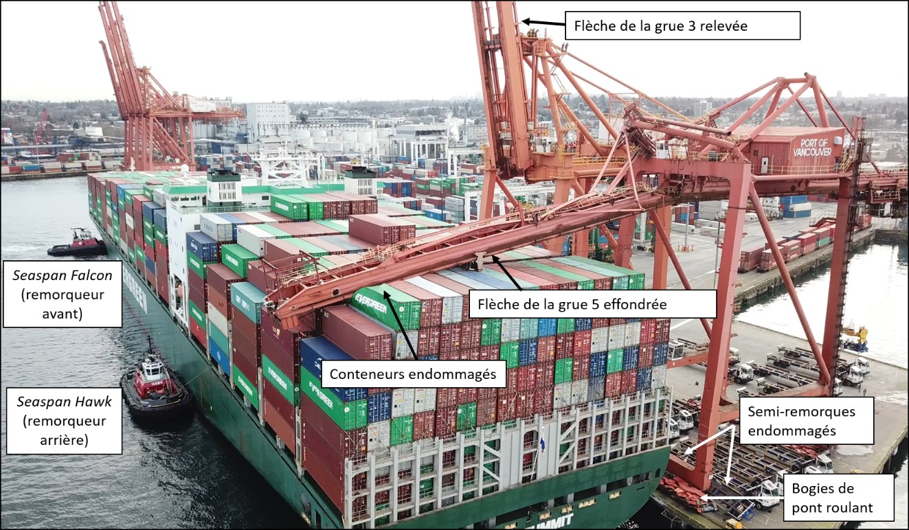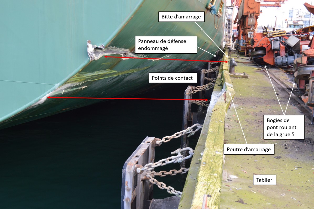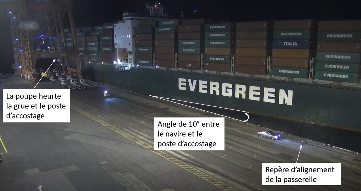 - En raison du grand porte-à-faux du navire et de la proximité de la grue par rapport à la ligne d’accostage, la coque du navire a percuté le poste d’accostage et la grue, ce qui a provoqué l’effondrement des bogies de pont roulant et la chute de la flèche sur le navire.