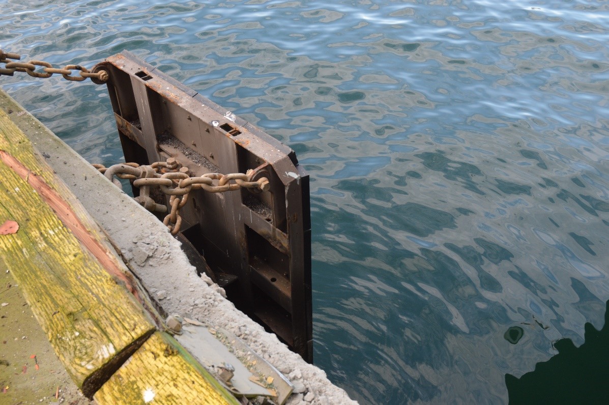 La bordure en béton du poste d’accostage a été endommagée par l’impact, et la poutre d’amarrage en bois a été fissurée et repoussée d’environ 8 cm au point de contact (figure 7). La bitte d’amarrage montrait des signes d’abrasion (figure 7) et 2 des panneaux de défense ont été tordus et présentaient des dommages sur la partie supérieure.