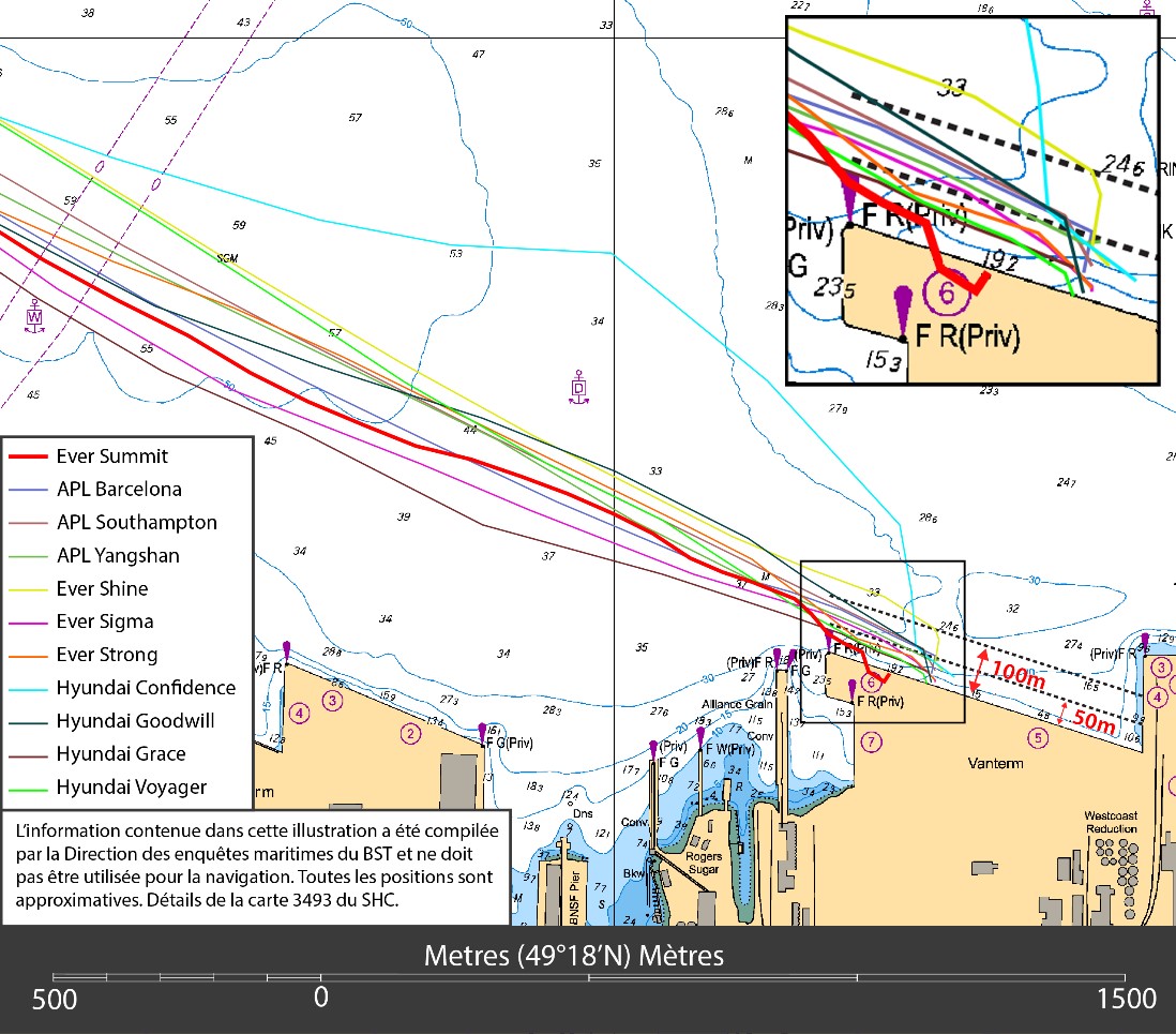 Une fois les remorqueurs attachés, l’Ever Summit a continué d’avancer vers le poste d’accostage et a réduit progressivement sa vitesse en mettant les moteurs à « en avant très lente » ou en coupant les moteurs. Aucun autre navire n’était ancré aux environs de Vanterm, au mouillage D ou au mouillage W, ce qui a permis une approche directe.
