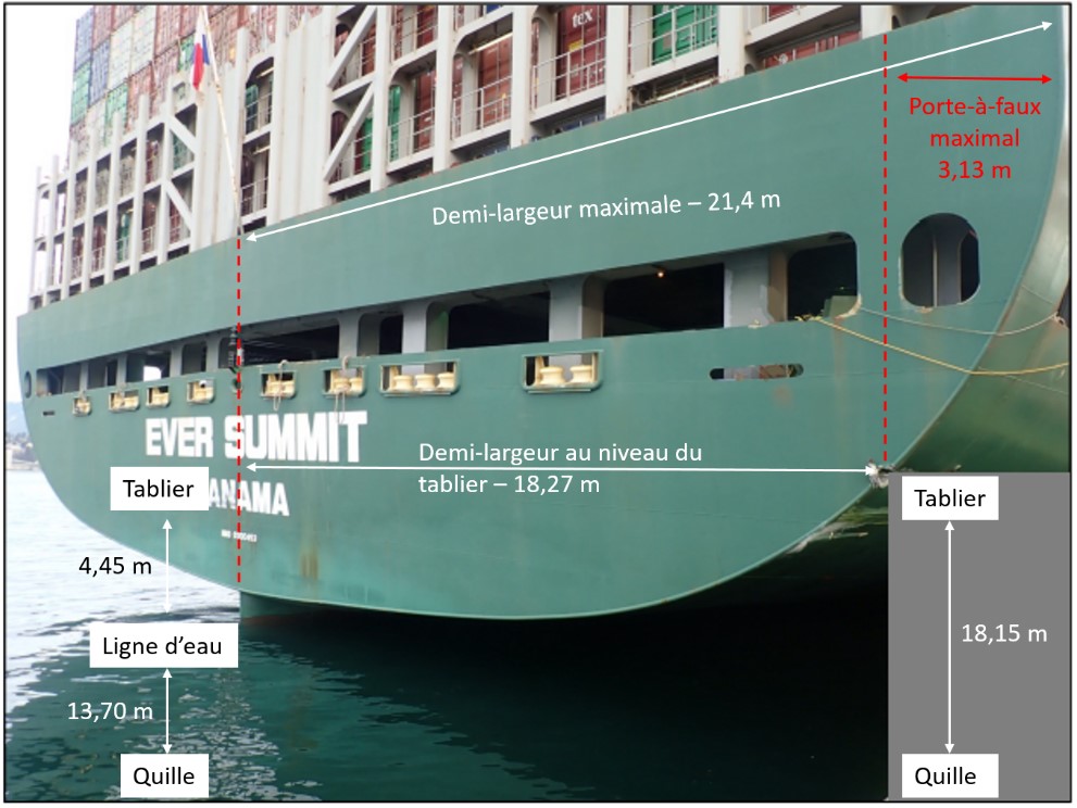 Pour déterminer le porte-à-faux maximal au tableau, on a calculé la différence entre la demi-largeur du navire au niveau du tablier et la demi-largeur maximale du navire. Il a été déterminé que le porte-à-faux maximal possible au tableau était de 3,13 m (figure D1).