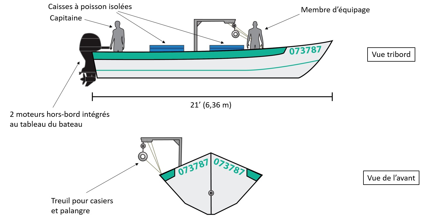 Le bateau dans l’événement à l’étude était un bateau de pêche non ponté en fibre de verre d’une longueur de 6,36 m à fond plat (figure 1). Il était propulsé par 2 moteurs hors-bord à essence (4 temps de 60 hp et 2 temps de 50 hp) et était muni d’un treuil pour casiers et palangre situé au milieu du bateau. Le bateau transportait 2 caisses à poisson isolées munies d’un couvercle avec courroies d’arrimage. Le bateau sans nom n’était pas immatriculé auprès de Transports Canada (TC), mais il était immatriculé auprès de Pêches et Océans Canada (numéro d’immatriculation de bateau 73787).