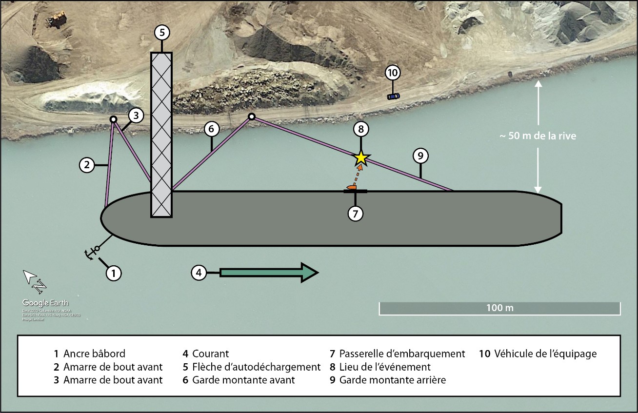 En raison de la façon dont les amarres du navire ont été disposées, ainsi que du fort courant bâbord, la route entre la passerelle d’embarquement et le véhicule de l’équipage à terre exigeait que le bateau de travail passe au-dessus de la garde montante arrière lâche, qui était immergée.