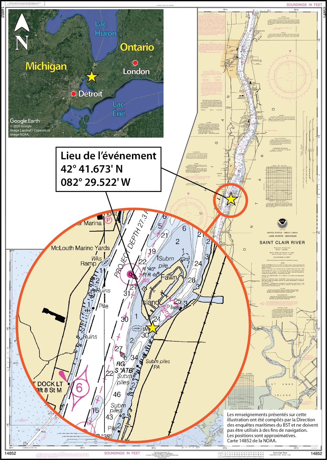 Source de l’image principale : National Oceanic and Atmospheric Administration, carte 14852 : Saint Clair River, avec annotations du BST