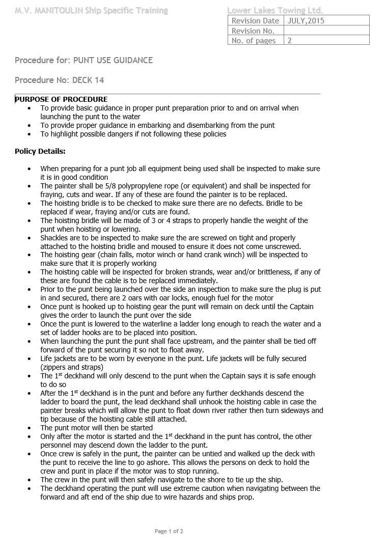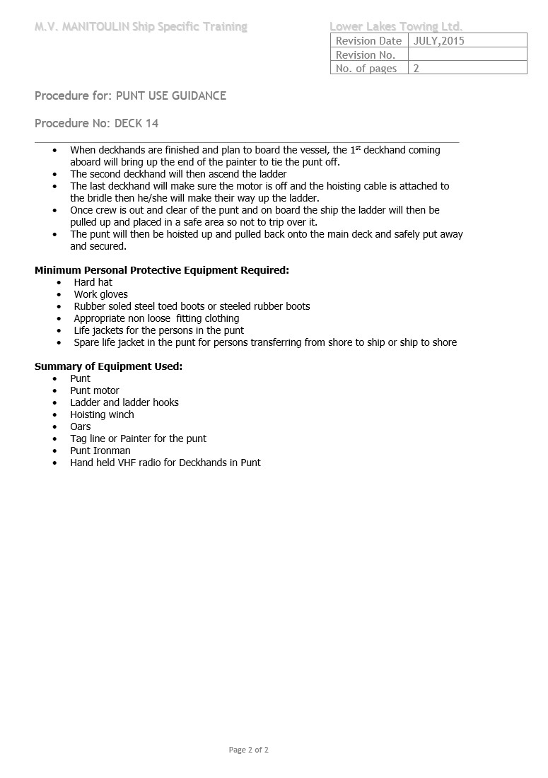 Le SGS du Manitoulin contenait une évaluation des risques liés à l’exploitation des bateaux de travail de la flotte, ainsi qu’une procédure d’exploitation des bateaux de travail. L’évaluation des risques et la procédure ont été élaborées en 2015. Ces documents étaient génériques et s’appliquaient à tous les bateaux de travail de la flotte.